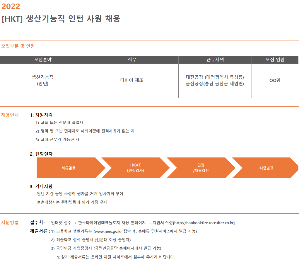 한국타이어앤테크놀로지 2022년 상반기 생산기능직 인턴 사원 모집