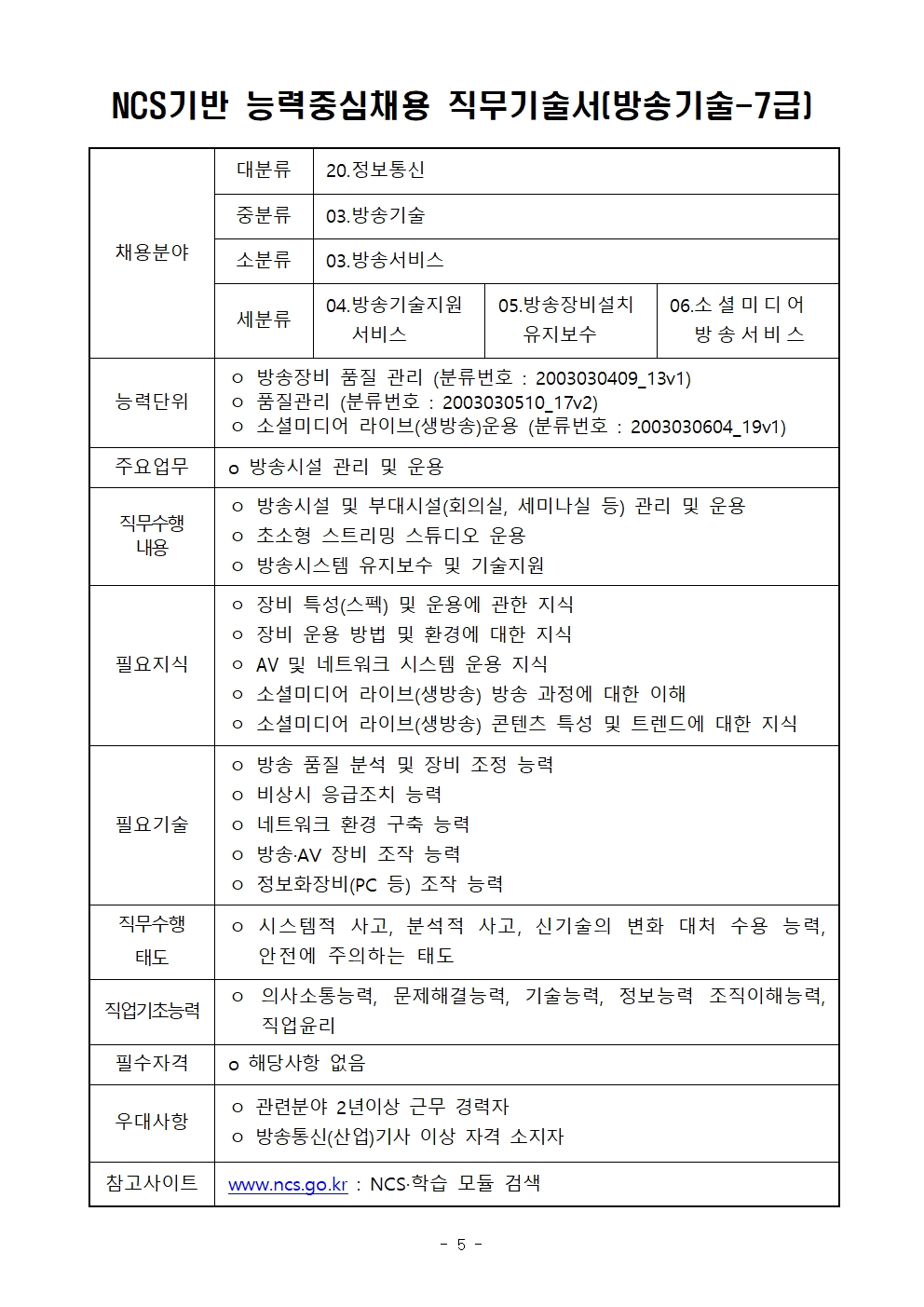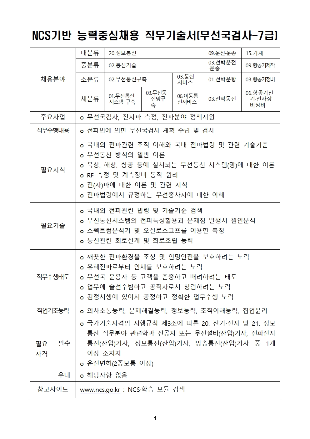 ◆ 국가기술자격법 시행규칙 제3조에 따른 20. 전기‧전자 및 21. 정보통신 직무분야 관련학과 전공자 또는 무선설비(산업)기사, 전파전자통신(산업)기사, 정보통신(산업)기사, 방송통신(산업)기사 중 1개 이상 소지자